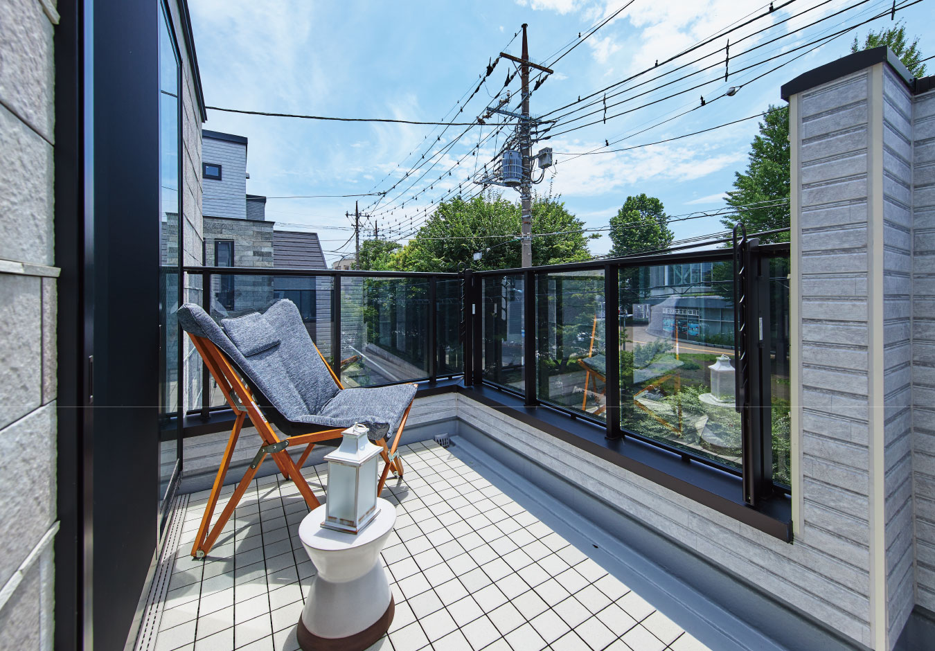 連窓デザインによるサッシとガラス手摺のバルコニー。