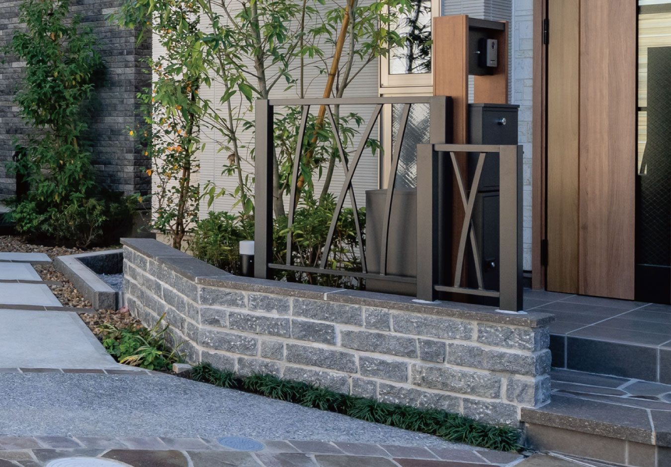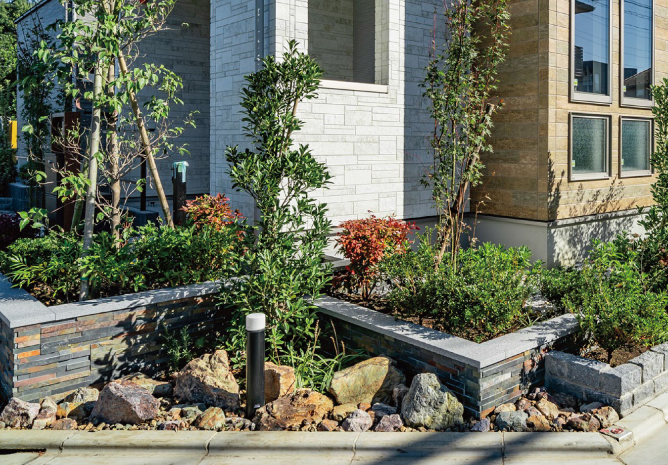 住まいの印象を引き立てる通りと連続した石積みの花壇。