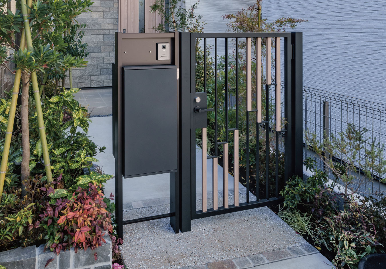 直線が基調のシャープなデザインが気品をもって迎えてくれる門扉。