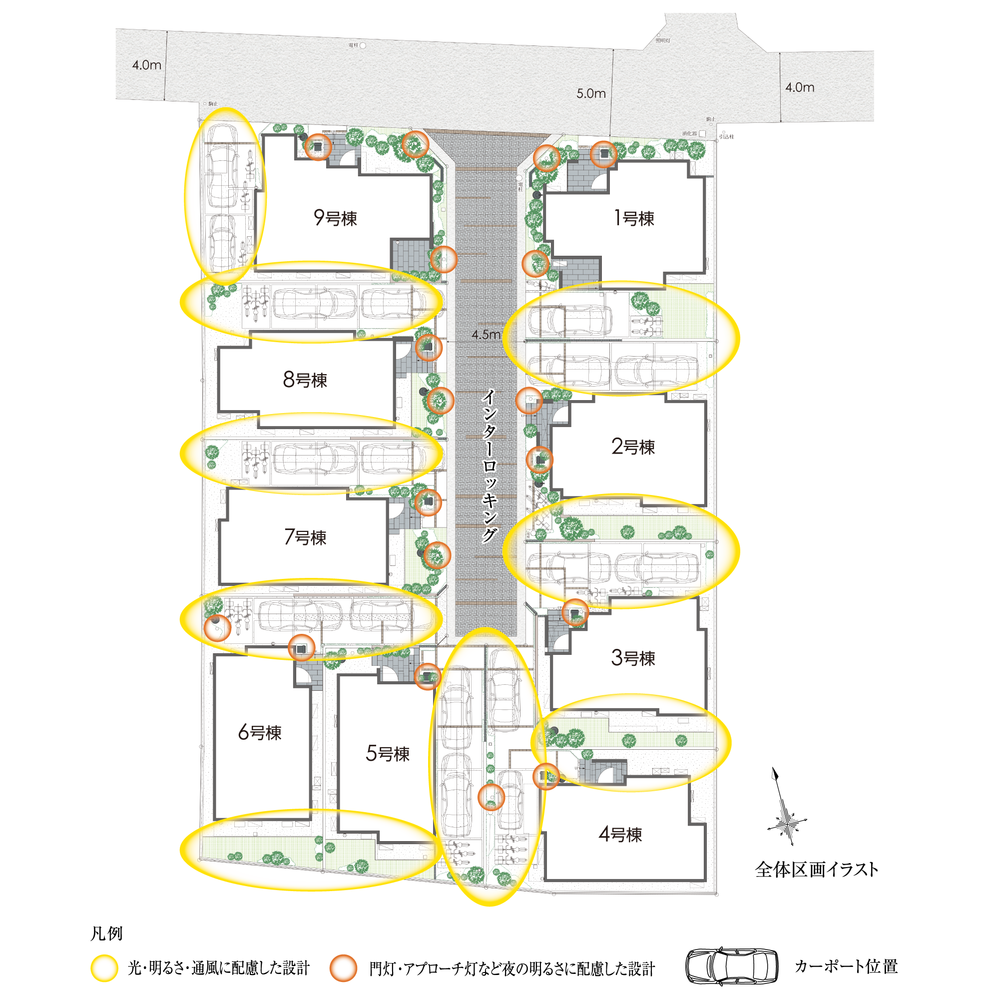 各邸にシンボルツリーを配植することで、街並にリズム感と緑の潤いを湛えています。