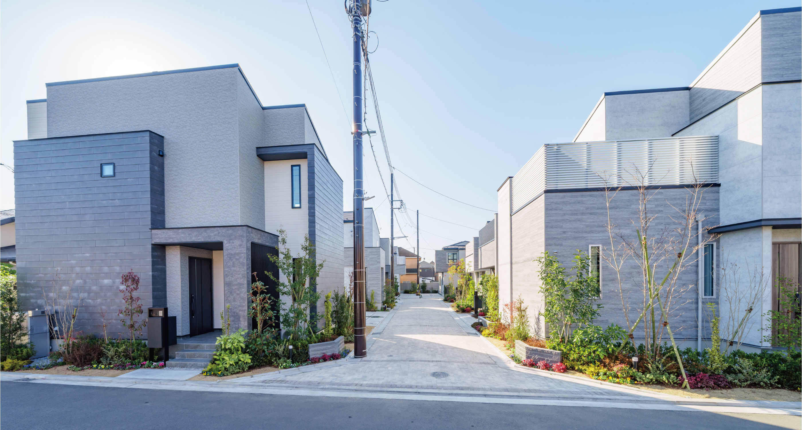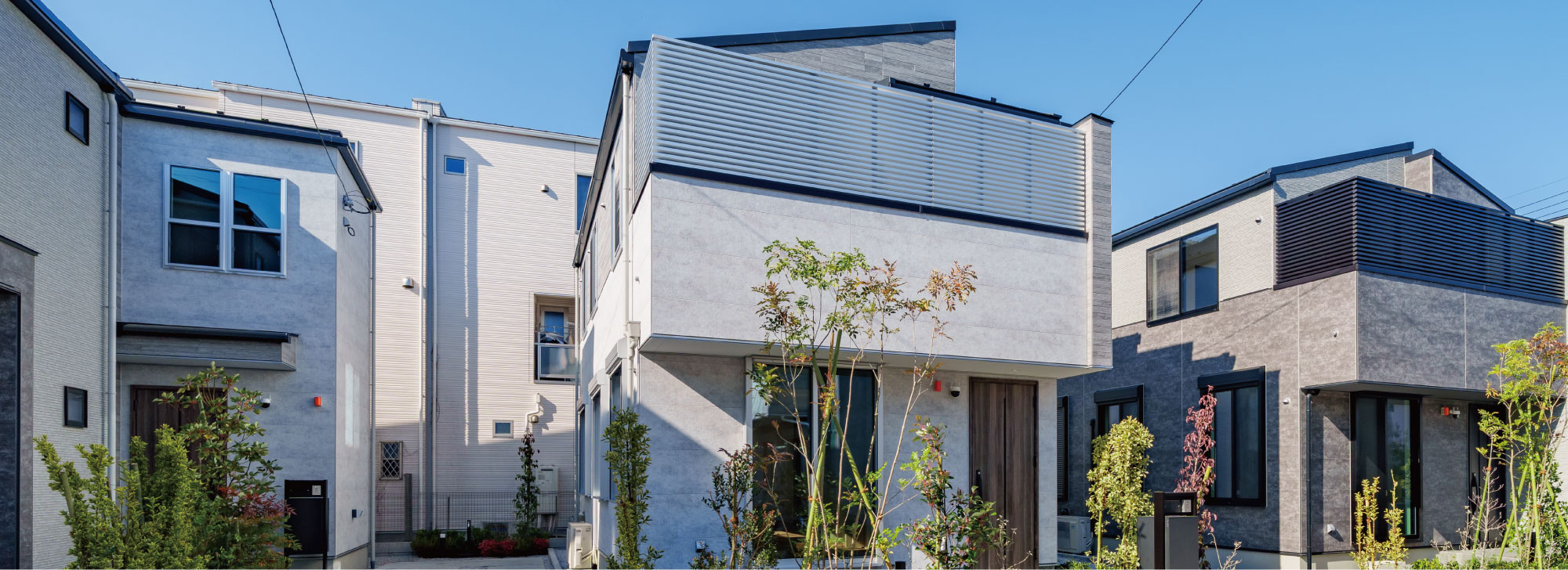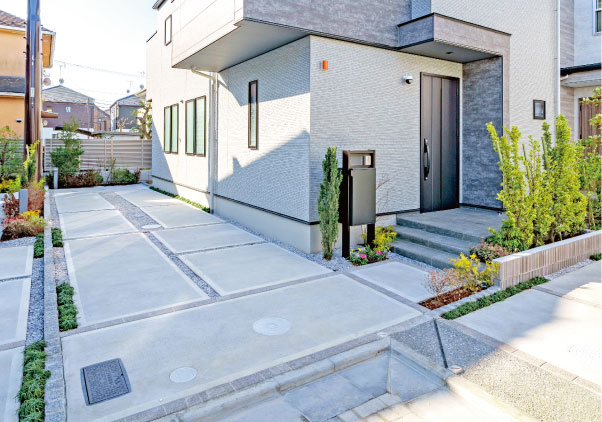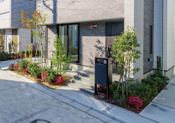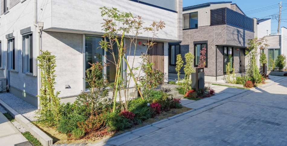 植栽を豊富に配したオープン外構が、潤いに包まれたスタイリッシュな街区を創出。サイディングとのコントラストが邸宅としての品格を高めます。