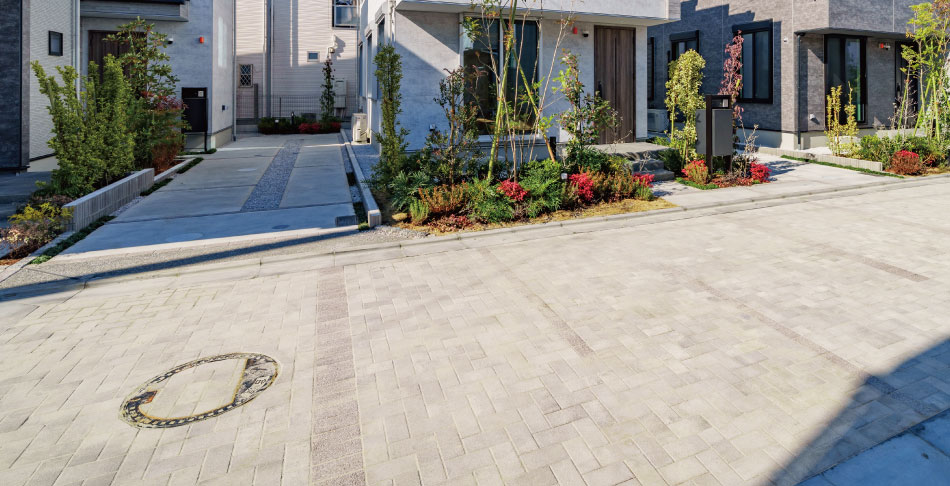街区に通り抜けのできない新設開発道路を設けました。インターロッキング舗装でプライベートな私邸街区の印象を与えます。