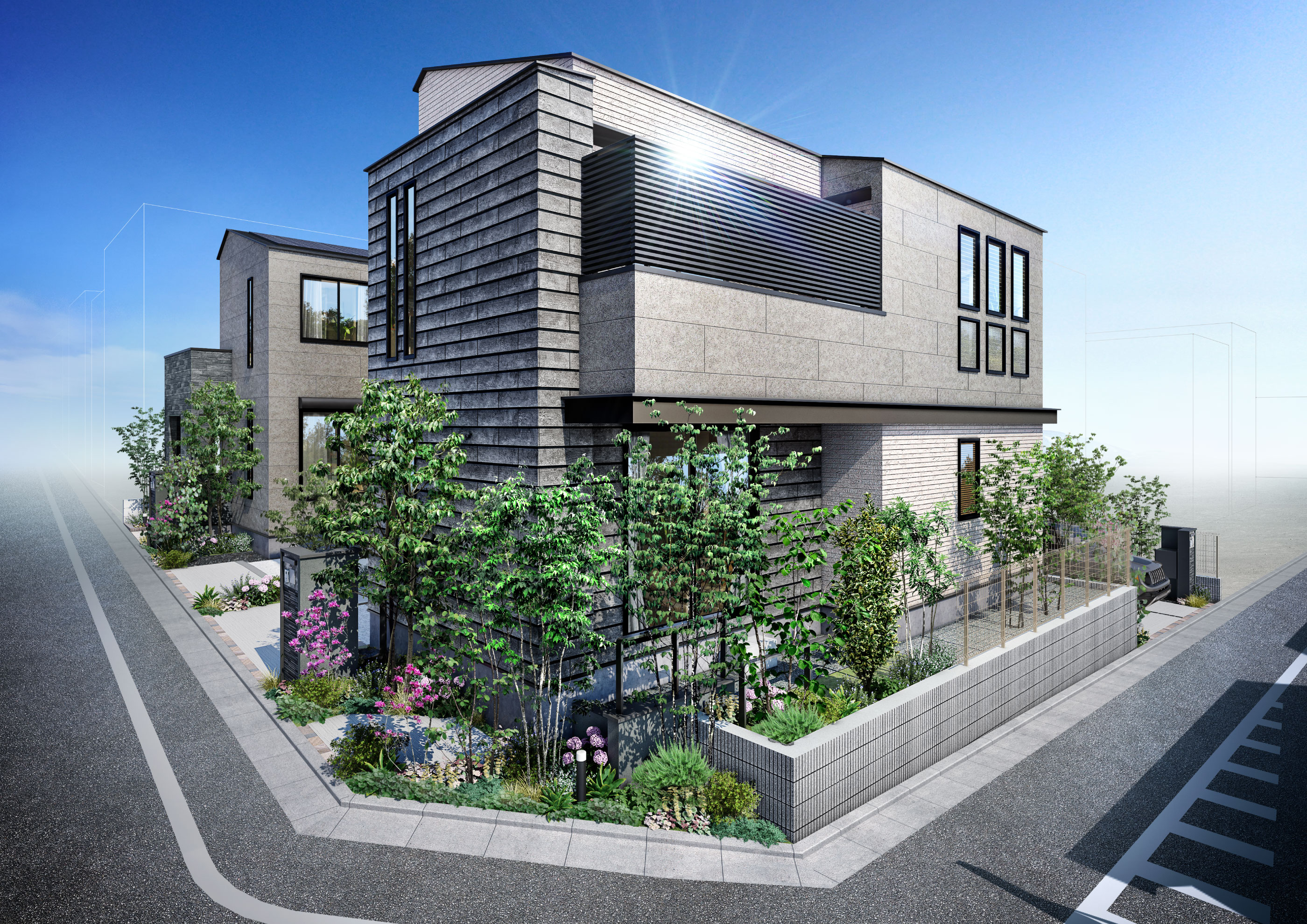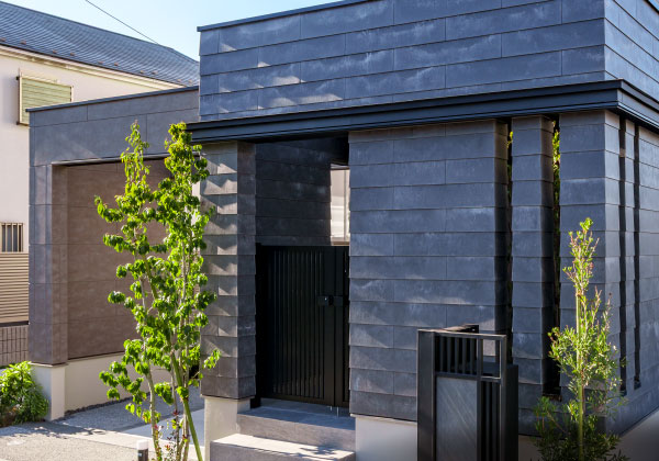 植栽を豊富に配したセミクローズ外構が、高級感や領域性を演出。サイディングとのコントラストが邸宅としての品格を高めます。