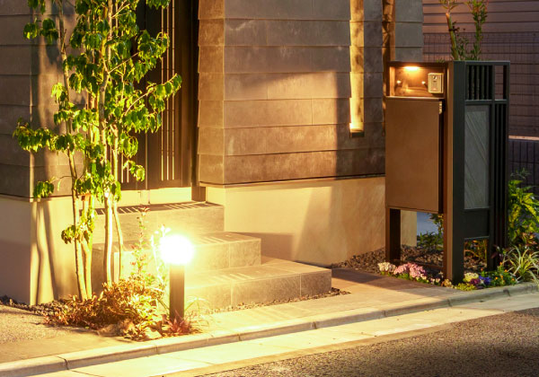 夜間になると自動点灯する門灯・アプローチ灯は、街並全体にスタイリッシュな印象を与え、防犯性も高めます。