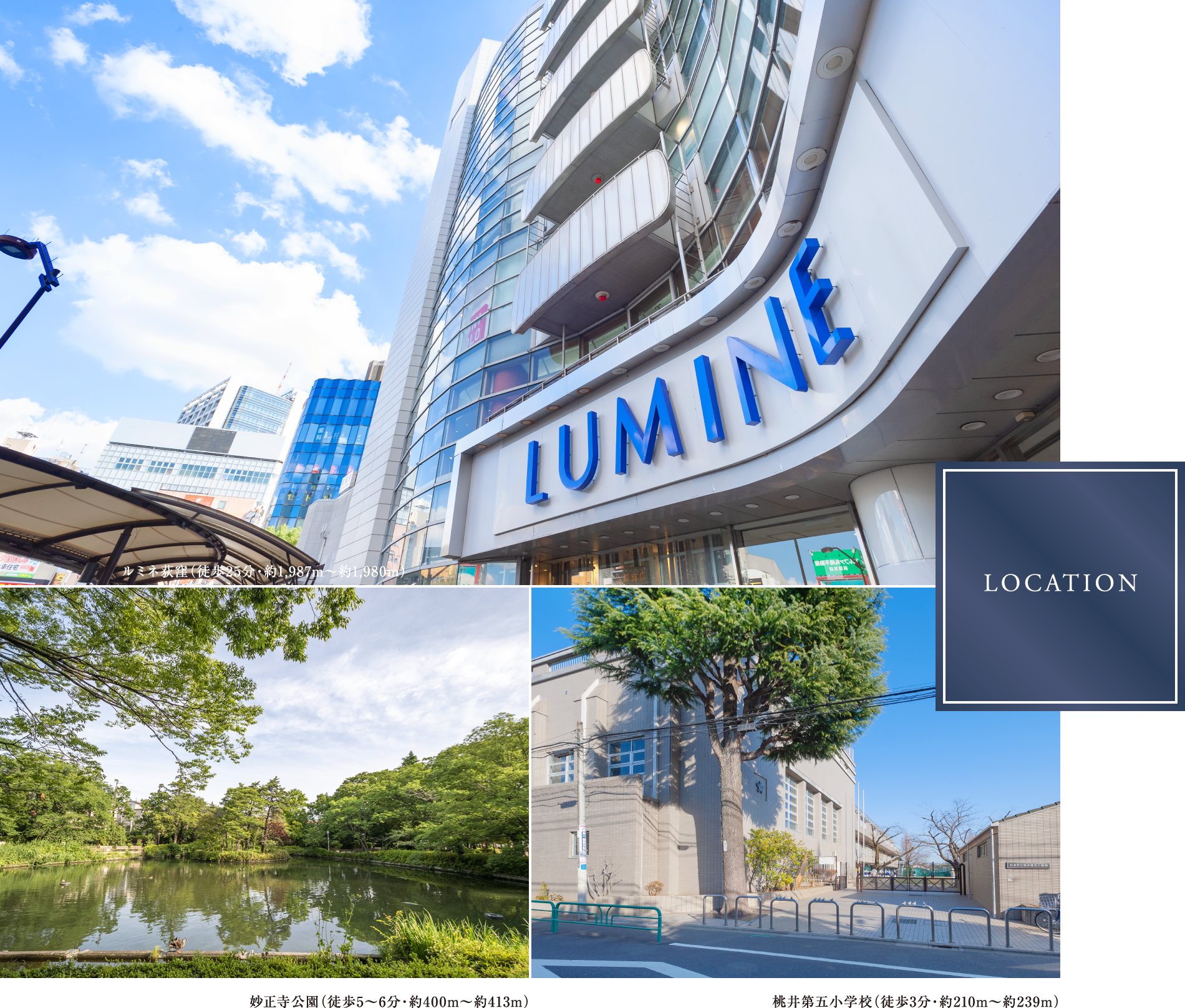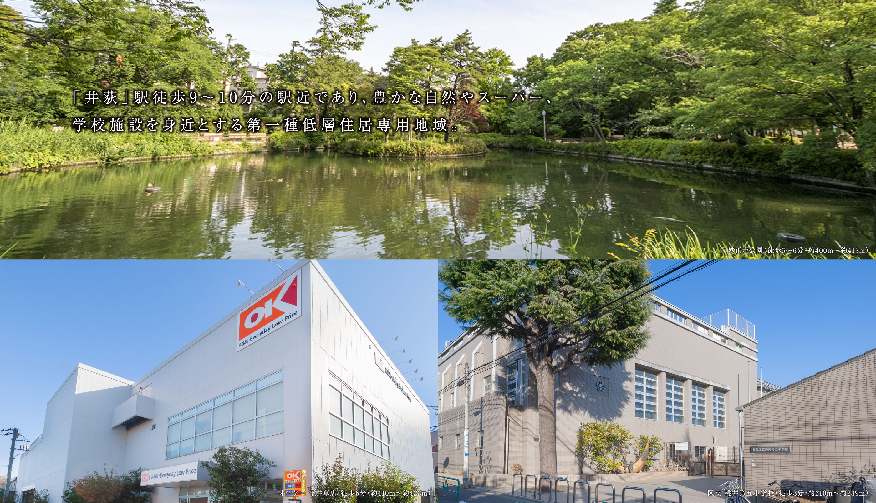 西武新宿線「井荻」駅より徒歩9〜10分、「下井草」駅より徒歩11分。