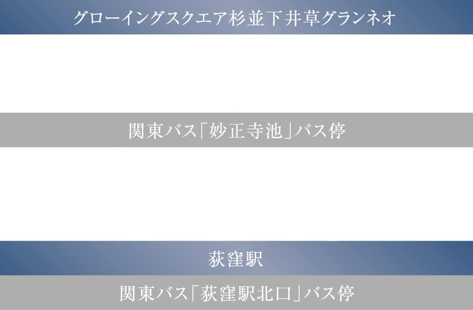 掲載の「妙正寺池」バス停発着のバス乗車時間は、通勤時(7時台及び8時台に最寄り駅発)及び日中平常時(9時台~16時台に最寄り駅発)の最短所要時間を表示しております。