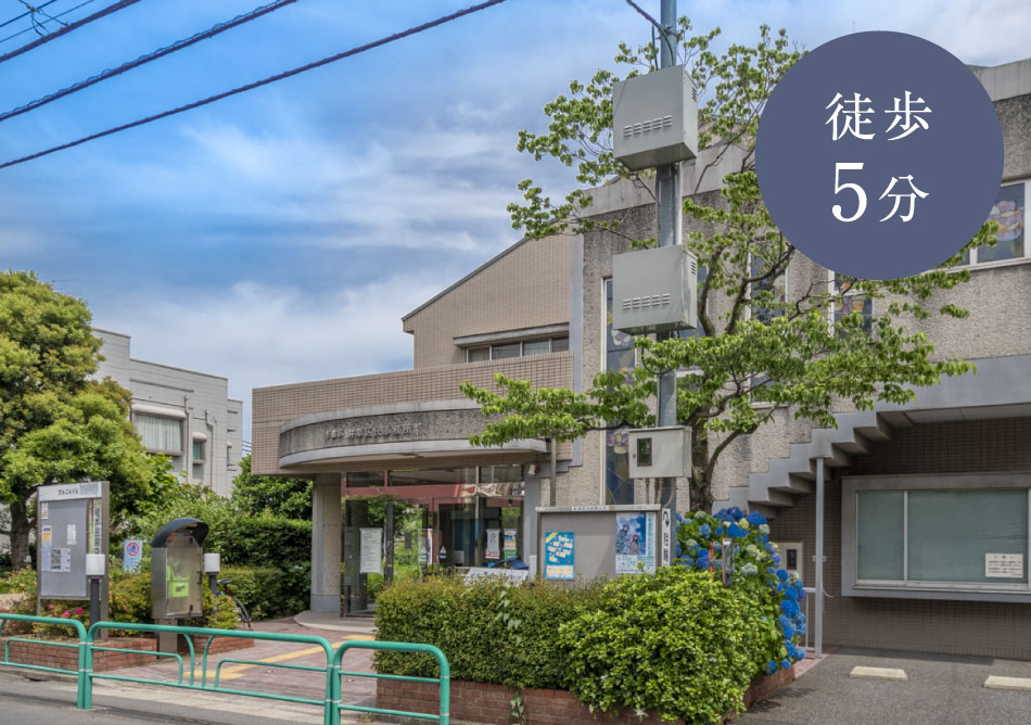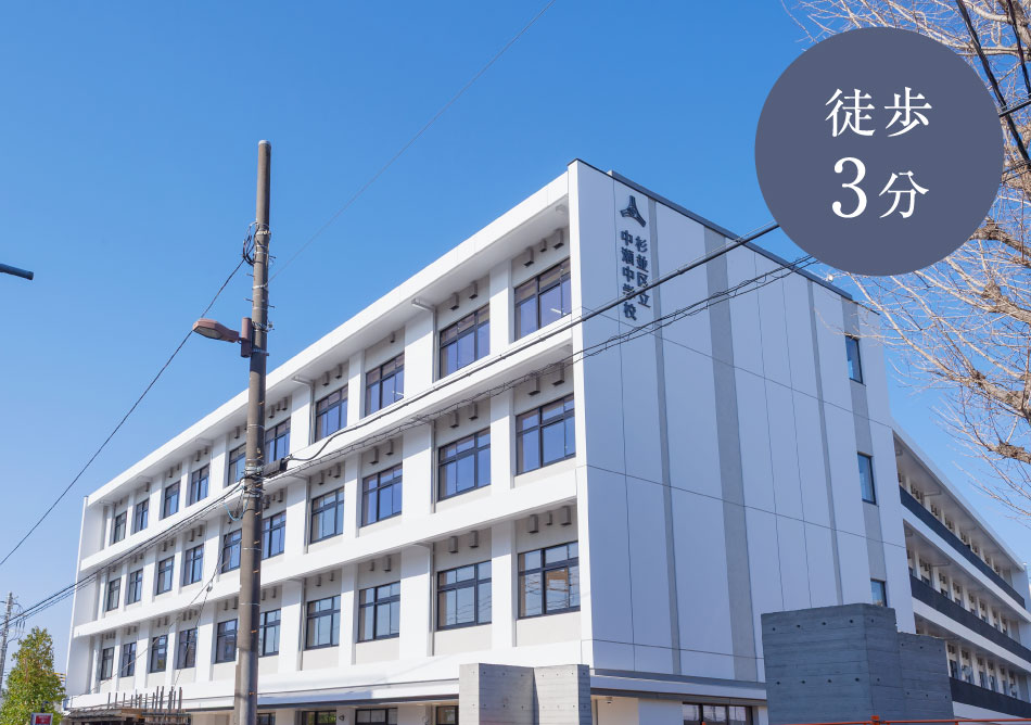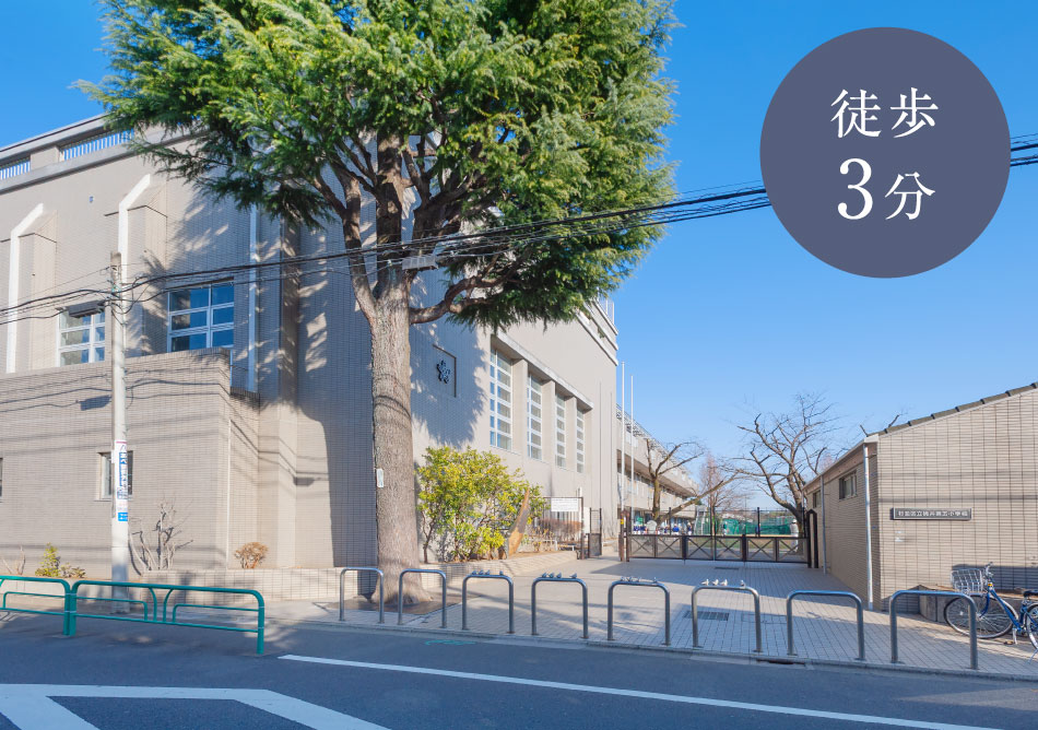 「やさしく かしこく たくましく」をスローガンに掲げる創立約90年の歴史ある小学校。全面芝生の校庭でお子さまがのびのびと過ごせます。わずか徒歩3分の近さにあるので、防犯面も安心です。