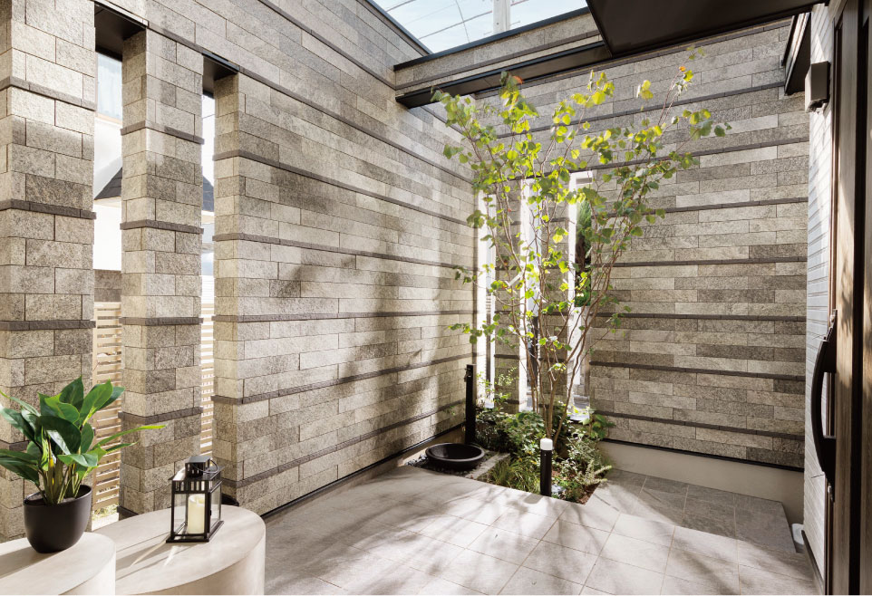 門扉の先に広々としたプライベートエントランスを設置。住まいに個性を湛えています。