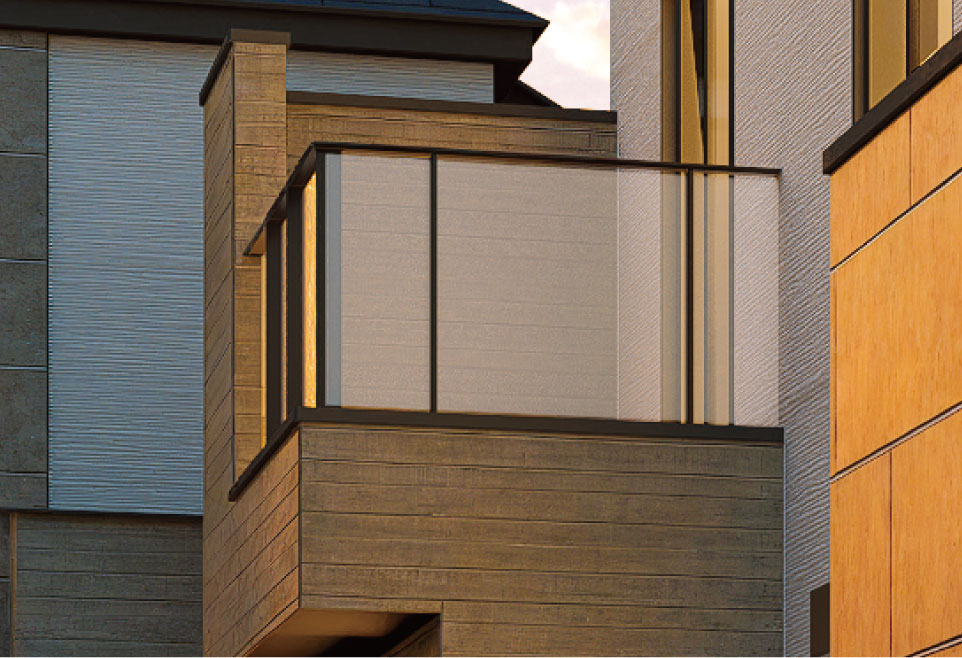 ガラスパネル手摺りは、ファサード面の開放感と美しさを創出します。また、格子手摺りは邸宅としての趣と高級感を演出します。