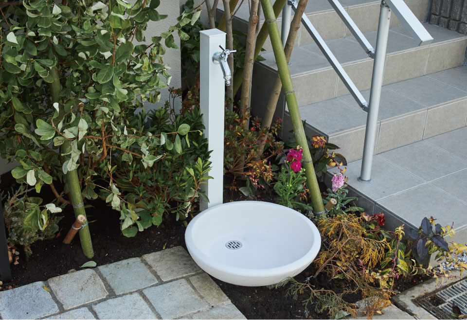 外出先からの手洗いも、外遊びで汚れたものでも、家に入る前に洗えます。ホースをつなげば植栽への水遣りにも便利です。