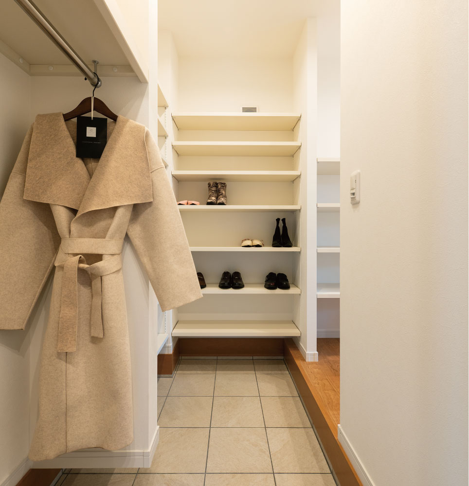 シューズインクロゼットは靴を履いたまま出入りできる収納スペース。可動棚を設けているので、家族分の靴や荷物がゆったりすっきり収納できます。